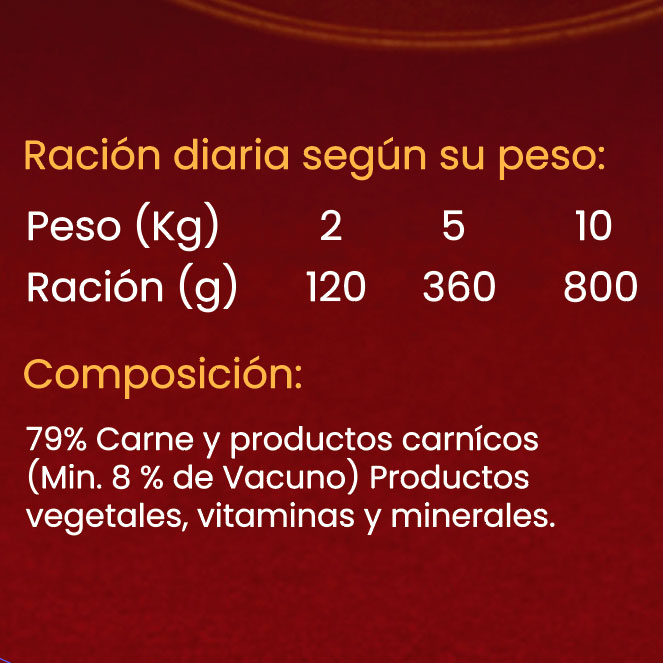 Composición: 79% carne y productos cárnicos (incluyendo un mínimo de 8% de vacuno).